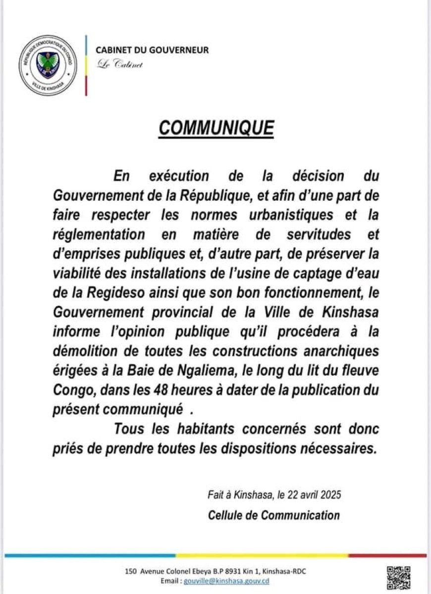 Suite à des pluies torrentielles à Kinshasa, dans le cadre d'une stratégie préventive, les responsables provinciaux ont pris la décision de raser toutes les constructions illégales situées à la Baie de Ngaliema, qui se trouvent le long du cours du fleuve Congo, dans un délai de 48 heures.